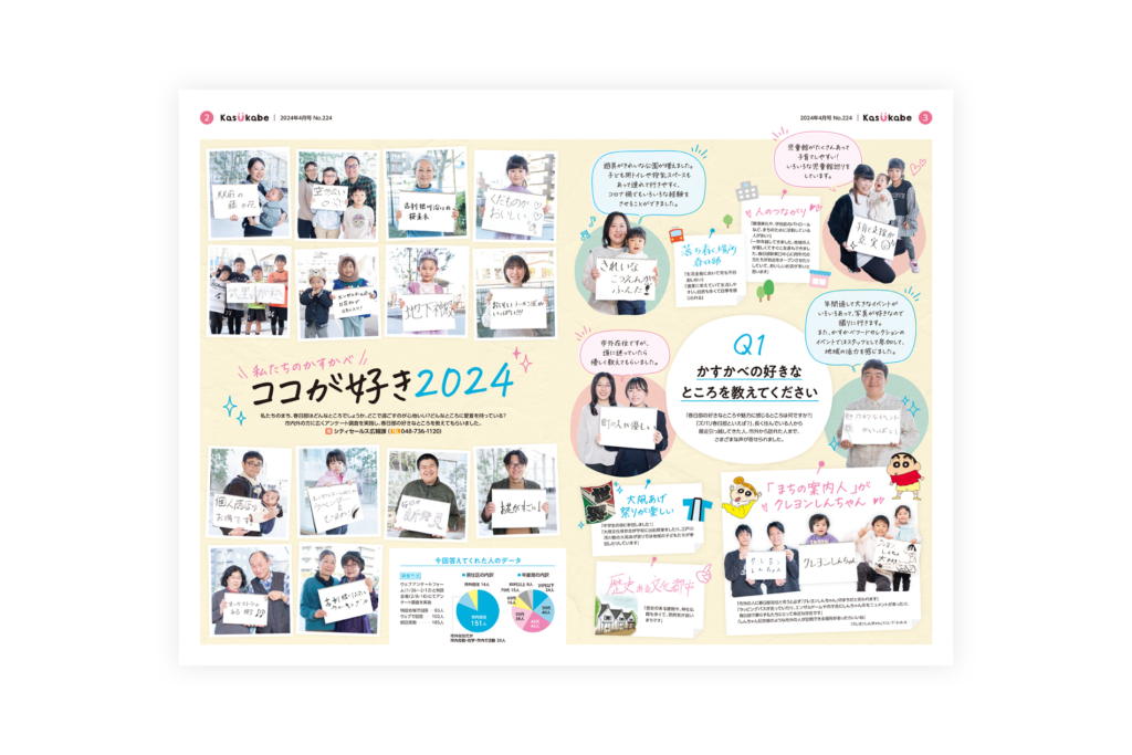 柳岡 「紙面をどう作ろうか考えるときに、知り合いの春日部市民の方の顔が浮かぶんです。この特集で紹介する内容は子供がいるAさんが知りたい情報だろうな、とか。こういう情報があると出不精なBさんも読んでくれそうかな、とか。紙面を通じて私の大好きな春日部市民の皆さんが笑顔になってくれるといいな、という気持ちで広報紙を作っています」