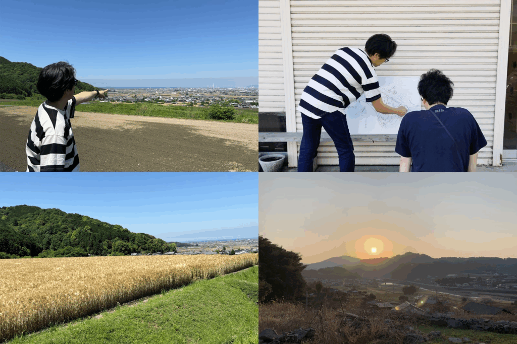 玉井)はだか麦の産地を見てもらおうと、まずは愛媛に来てもらいました。早朝散歩してたら鹿やイノシシに会うような、田舎の耕作放棄地の棚田に来てもらいました。