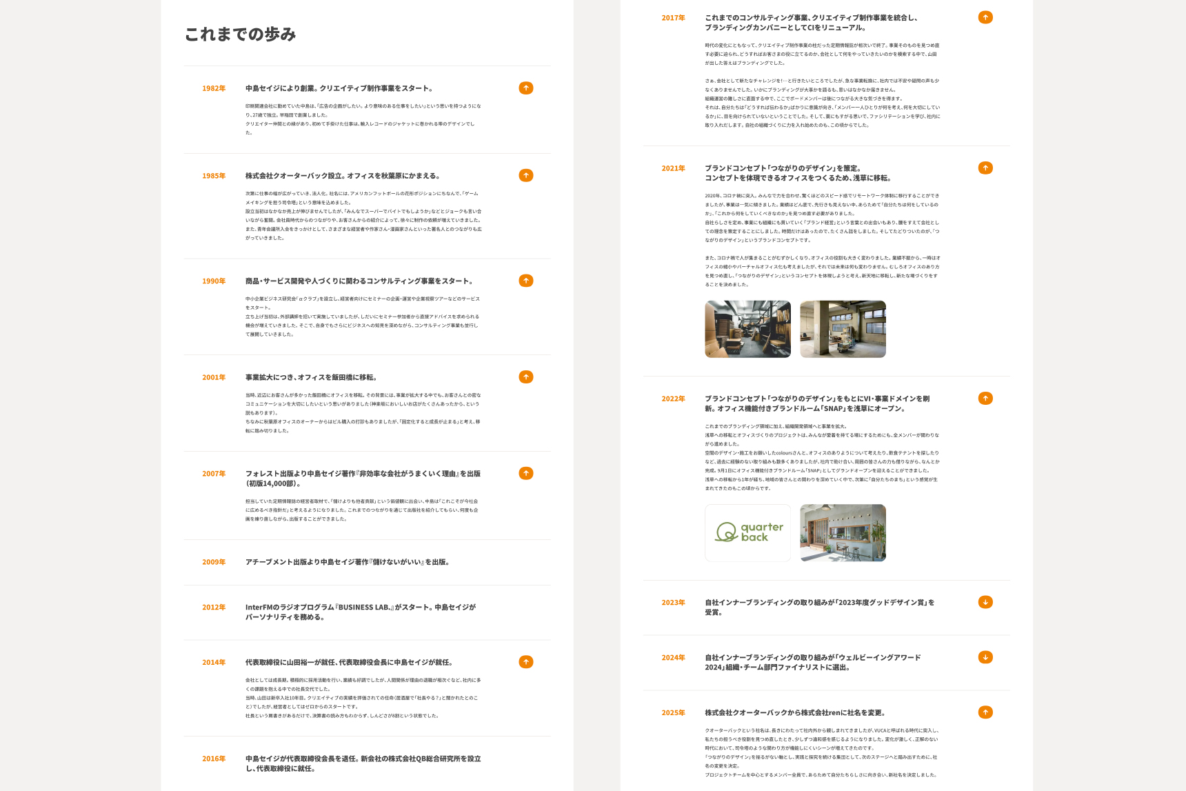 塚本) 長い時間かけて積み上げてきたものや変化してきたものって感じにくい。だからこそ、今回の社名変更のように定点観測する機会は大事なんだと思う。サイトのコンテンツにもしたけど、クオーターバックや中島さんの歴史を振り返ることで発見もあった。会社の歴史って普段聞けない、振り返らないからこそ、改めて立ち止まることも必要よね。